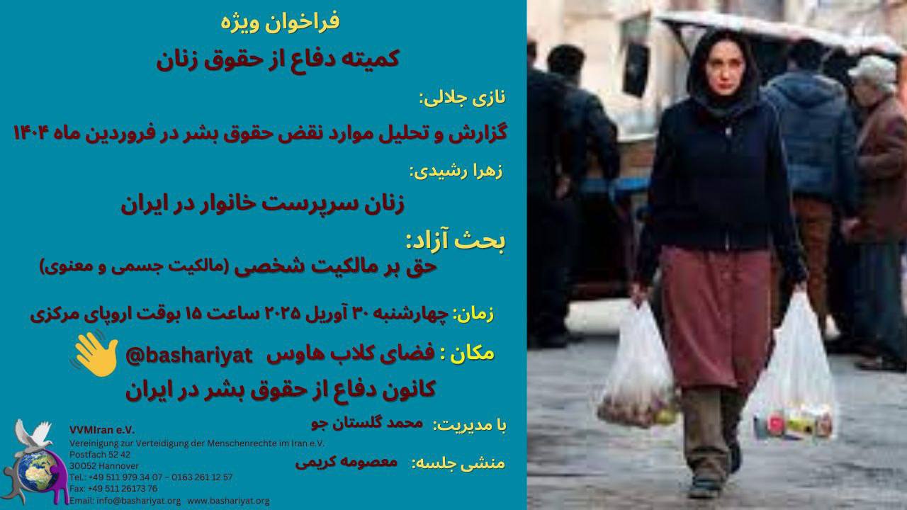 جلسه ویژه کمیته دفاع از حقوق زنان مورخ ۳۰ آوریل ۲۰۲۵ در ساعت ۱۵:۰۰ به وقت اروپای مرکزی در فضای مجازی کلاب هاوس با مدیریت آقای محمد گلستانجو ، سخنران اول: خانم نازی جلالی با موضوع “گزارش و تحلیل موارد نقض حقوق زنان در ایران در فروردین ماه ۱۴۰۴” ، سخنران دوم: خانم زهرا رشیدی با موضوع” زنان سرپرست خانوار در ایران” و بحث آزاد با موضوع “حق بر مالکیت شخصی(مالکیت جسمی و معنوی) ” برگزار گردید. همکارانی که مارا در برگزاری این جلسه یاری کردند عبارتند از: مسئول جلسه : آقای محمد گلستانجو ، منشی جلسه: خانم معصومه کریمی، ضبط صدا و تدوین: خانم حدیث خوبرفتار. علاقمندان می توانند گزارش صوتی جلسه فوق را از طریق فایل های صوتی زیر شنوا باشند.