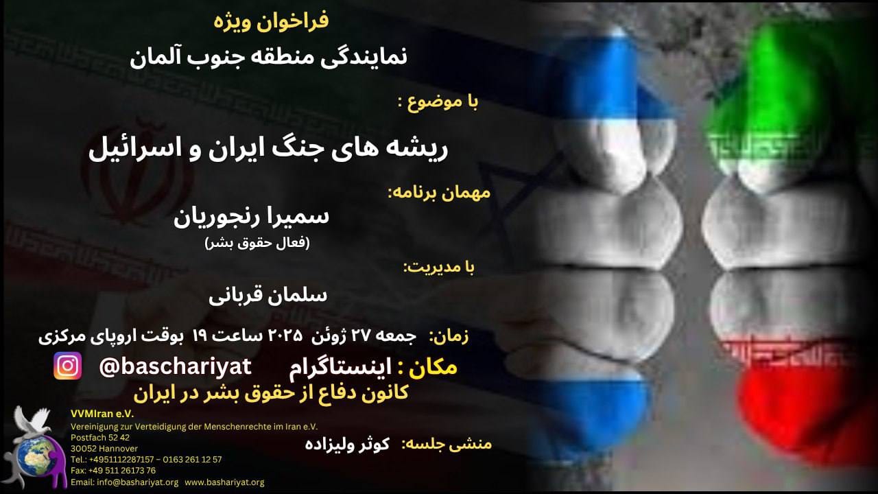جلسه صوتی لایو اینستاگرام نمایندگی منطقه جنوب آلمان در تاریخ ۲۷ ژوئن ۲۰۲۵ در ساعت ۱۹ به وقت اروپای مرکزی از طریق فضای مجازی اینستاگرام با مدیریت آقای سلمان قربانی و میهمان جلسه: خانم سمیرا رنجوریان با موضوع: ریشه های جنگ ایران و اسرائیل برگزار گردید. همکارانی که ما را در برگزاری این جلسه لایو یاری کردند عبارتنداز:مسئول جلسه:آقای سلمان قربانی، منشی جلسه: خانم کوثر ولیزاده،ضبط صدا و تدوین: آقای سینا اشجعی.علاقمندان می توانند گزارش صوتی جلسه فوق را از طریق فایل های صوتی زیر شنوا باشند.