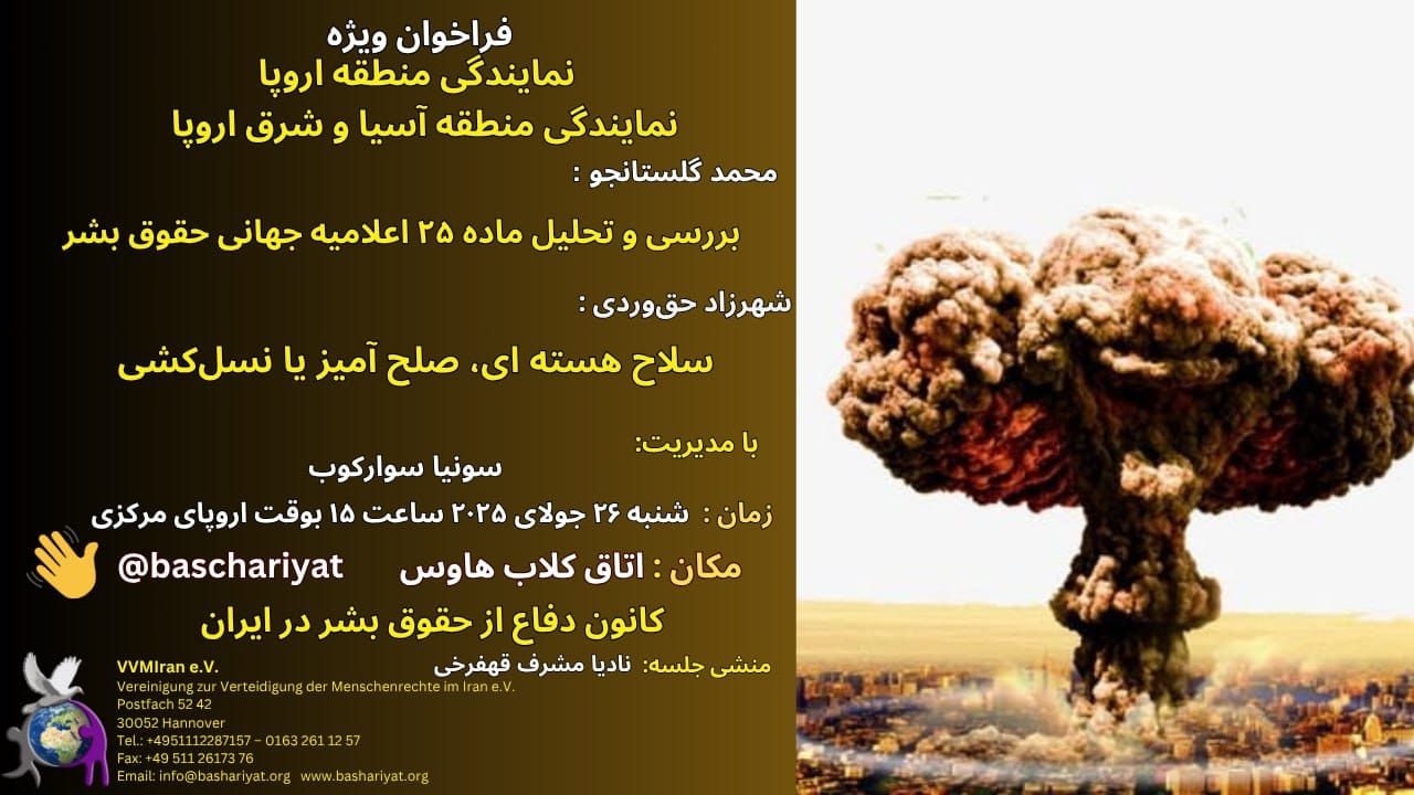 جلسه ویژه مشترک نمایندگی اروپا و نمایندگی آسیا و شرق اروپا در تاریخ ۲۶ جولای ۲۰۲۵ و در ساعت ۱۵:۰۰ به وقت اروپای مرکزی از طریق فضای مجازی کلاب هاوس، با مدیریت سونیا سوارکوب و مهمانان جلسه: شهرزاد حق وردی با موضوع: سلاح هسته ای، صلح آمیز یا نسل کشی، و محمد گلستانجو با موضوع: بررسی و تحلیل ماده ۲۵ اعلامیه جهانی حقوق بشر، برگزار گردید. همکارانی که ما را در برگزاری این جلسه لایو یاری کردند عبارتند از: مسئول جلسه: سونیا سوارکوب، منشی جلسه: نادیا مشرف قهفرخی، ضبط صدا و تدوین: علیرضا جهان بین. علاقمندان می توانند گزارش صوتی جلسه فوق را از طریق فایل های صوتی زیر شنوا باشند: